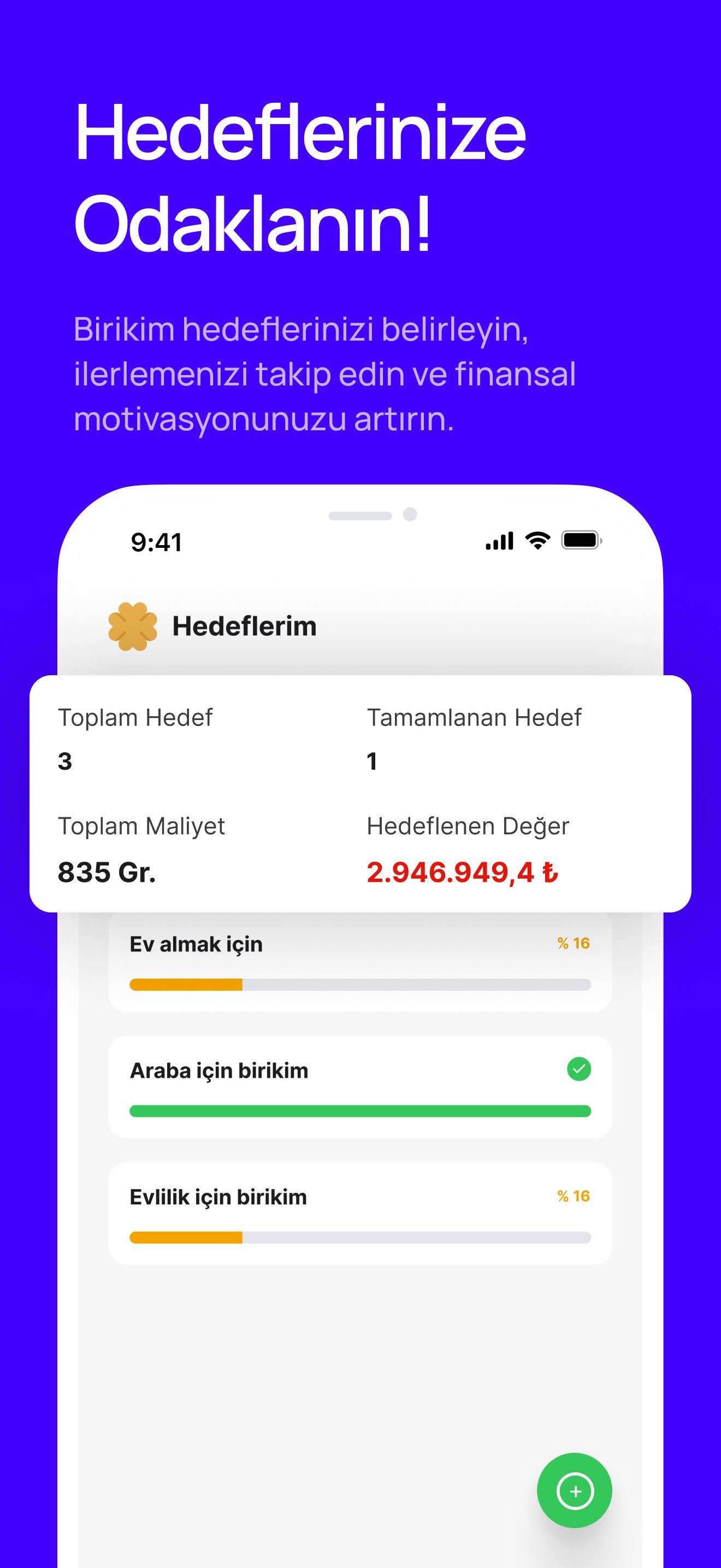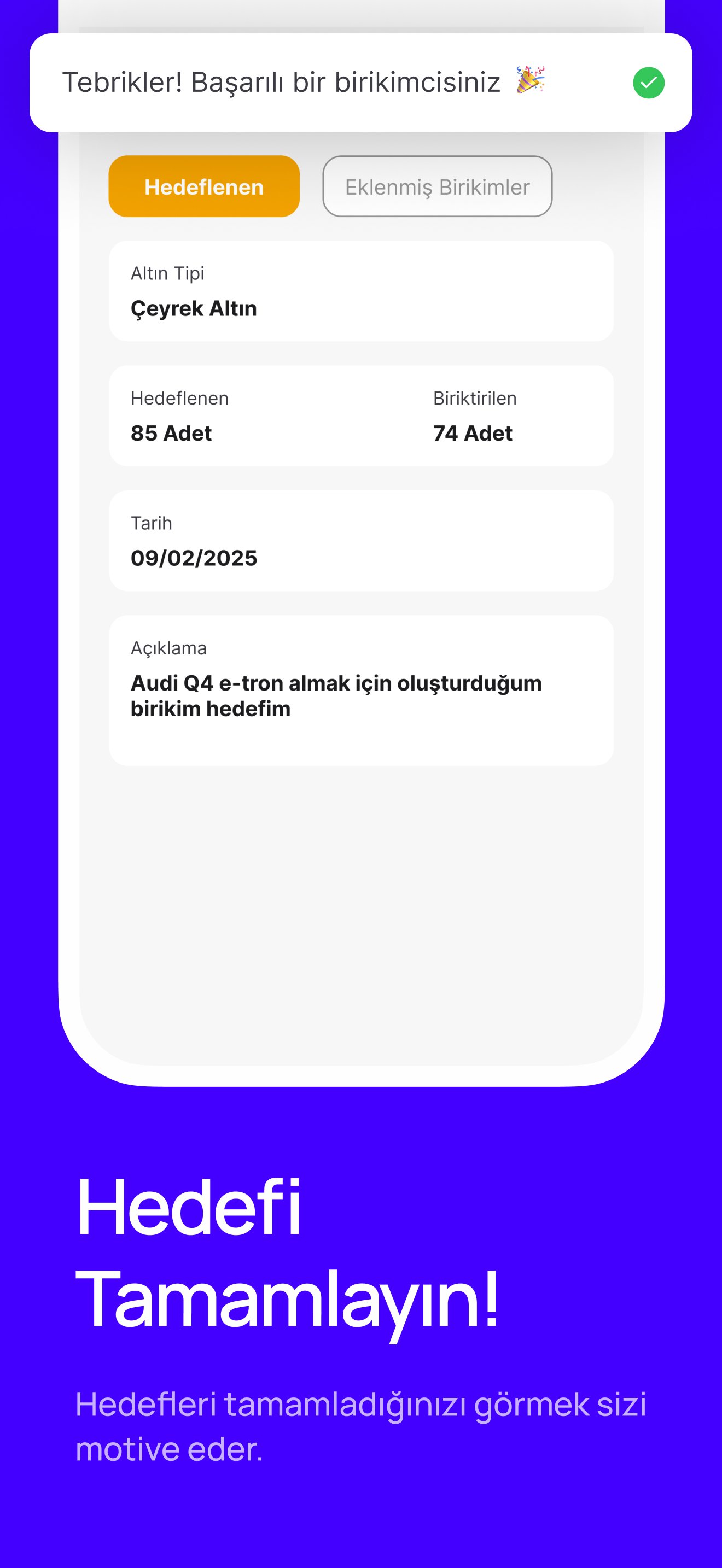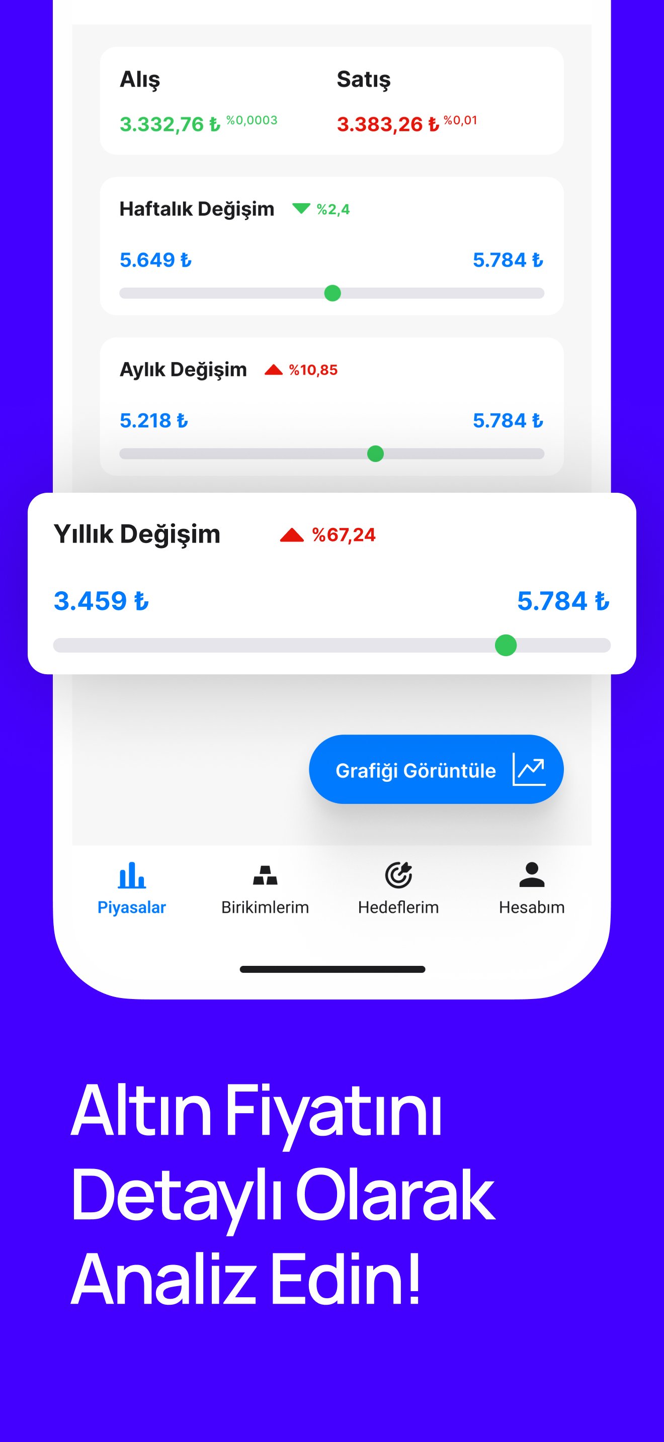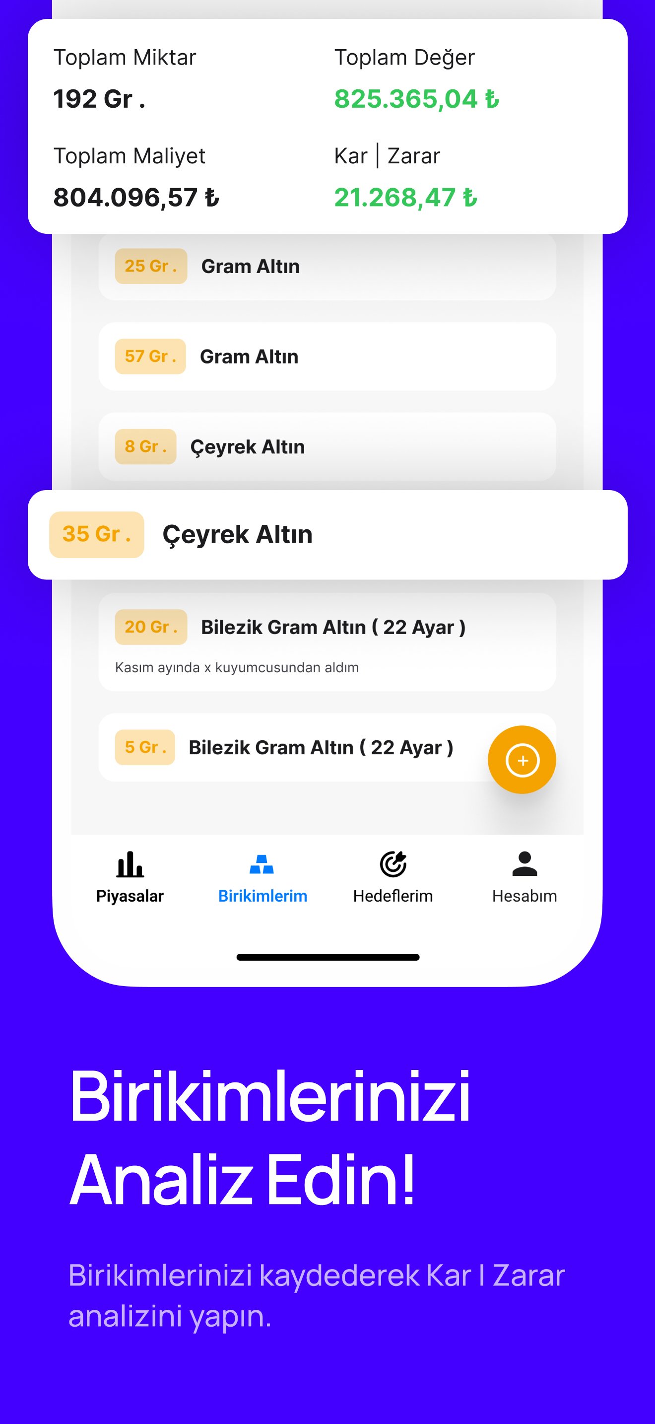 Anlık veya geçmişe yönetlik altın fiyatlarını takip edin, birikimlerinizi kaydedip kar/zarar analizleri yapın ve hedefler ekleyerek birikim motivasyonunuzu artırın 🚀